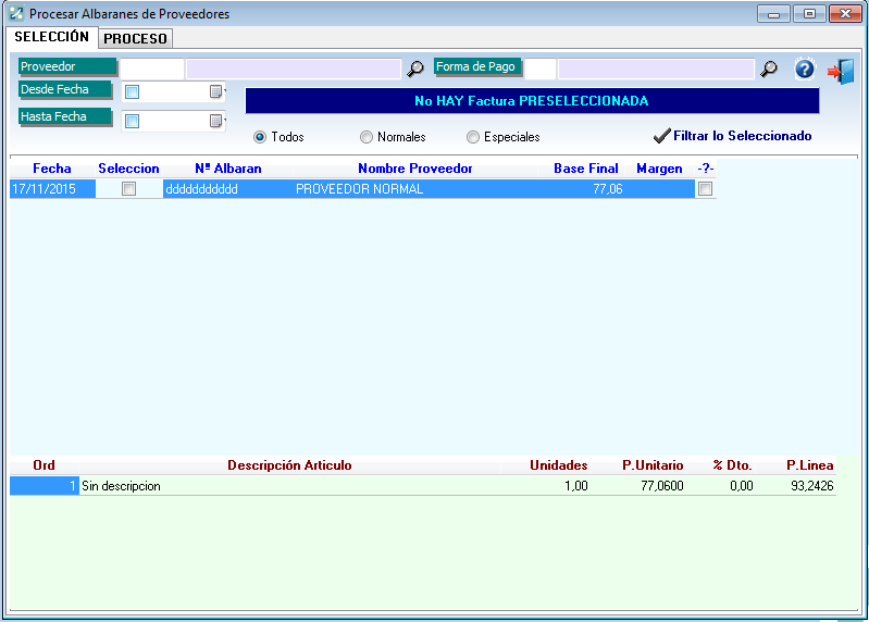 El propósito de este Formulario es el de ofrecer 1º la posibilidad de Filtrar Albaranes de Compra a Proveedores, para poder generar en nuestra BBDD las facturas recibidas de los mismos, partiendo de los albaranes recibidos e introducidos por Ud. previamente.